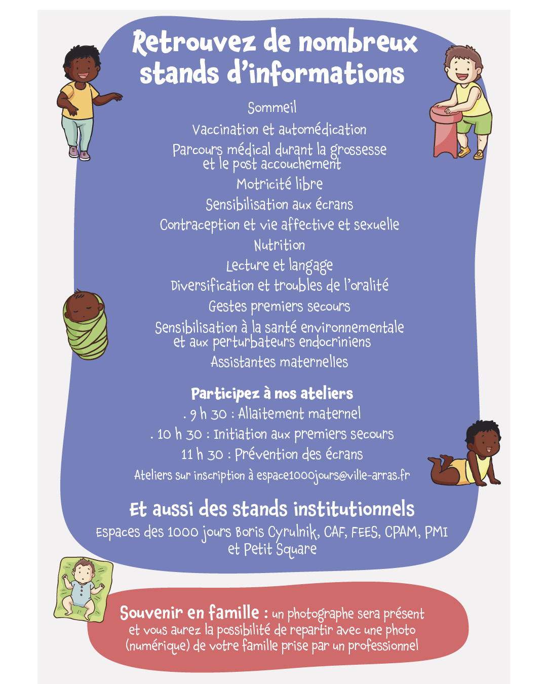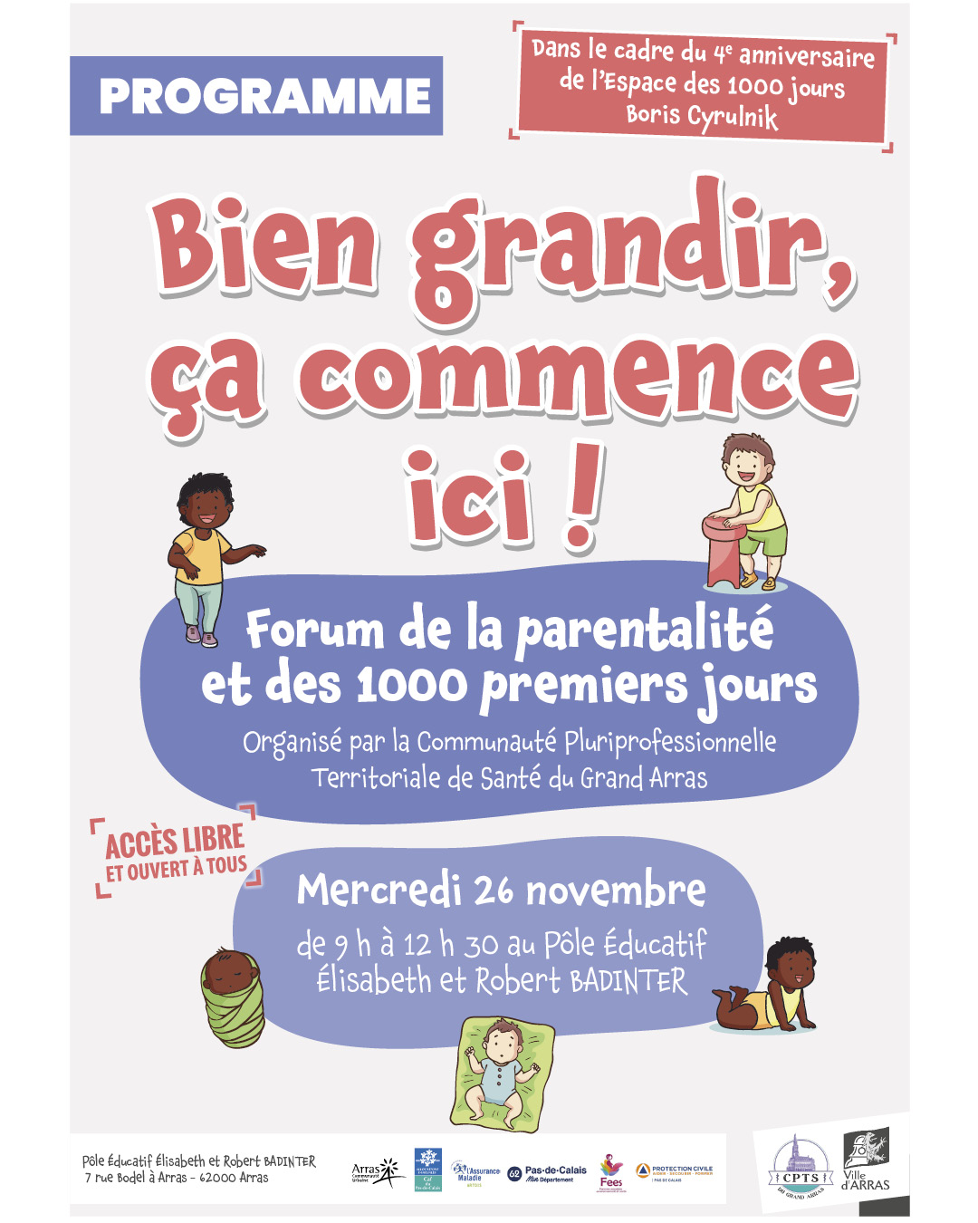 0 Bien grandir, ça commence ici ! Forum de la parentalité et des 1000 premiers jours Mercredi 26 novembre de 9h à 12h au Pôle Éducatif Élisabeth et Robert BADINTER