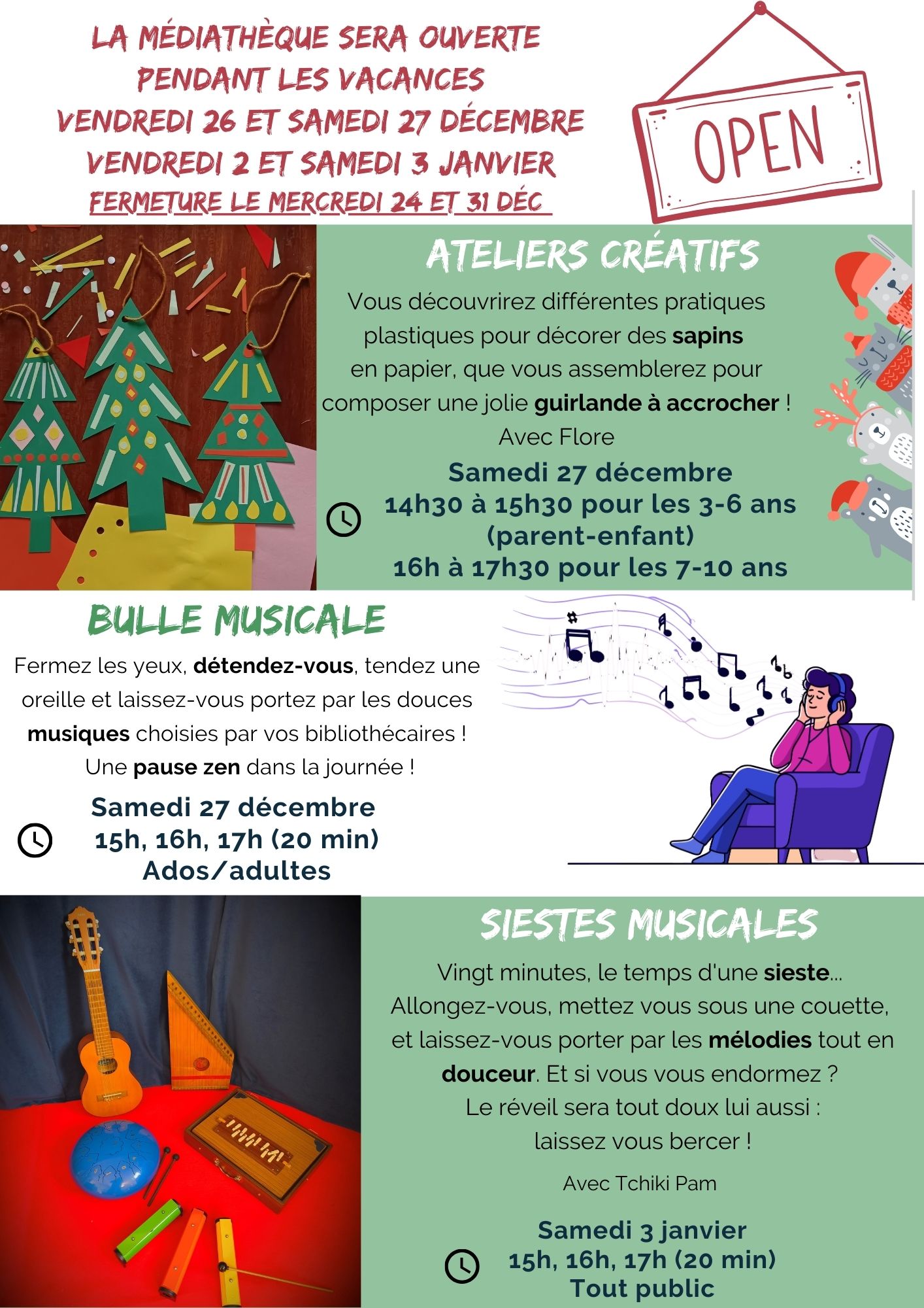 La médiathèque sera fermée les mercredis 24 et 31 mais ouverte les vendredis et samedis 26, 27 déc et 2, 3 janvier ! Venez profiter de nos animations et faire le plein de lectures