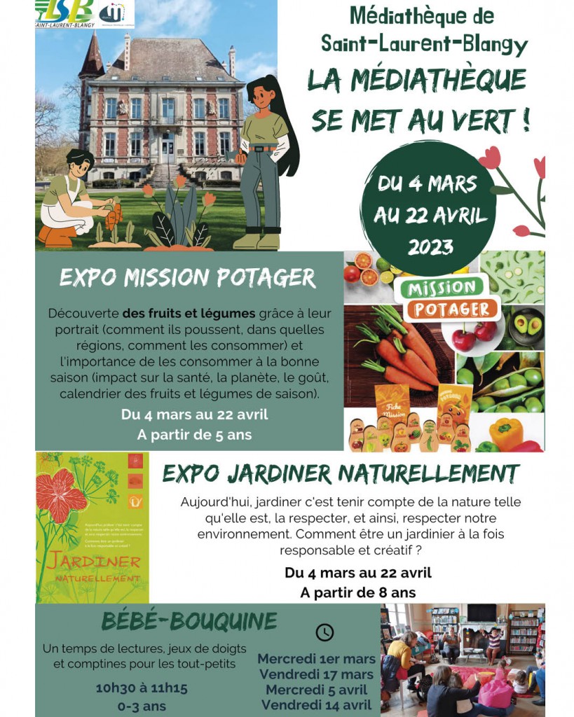 0 La Médiathèque se met au vert Retrouvez ci-dessous le programme du mois de mars Expositions ; bébé-bouquine (0/3ans) ; ateliers ; spectacle, etc