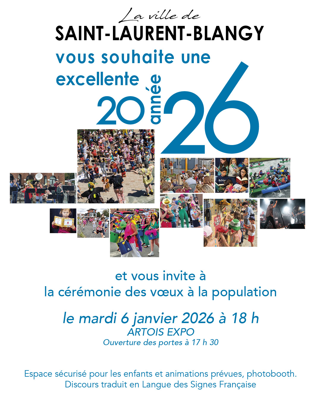 0 La ville de Saint-Laurent-Blangy vous souhaite une excellente année 2026 et vous invite à la cérémonie des vœux à la population le mardi 6 janvier 2026 à 18h Artois Expo