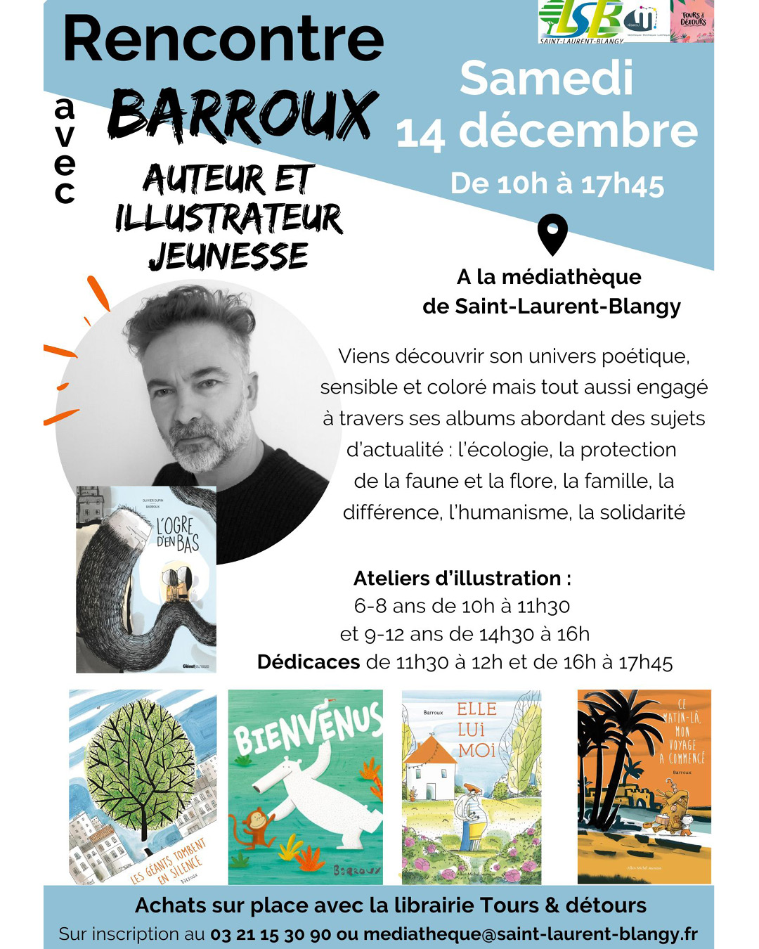 Barroux sera présent la semaine du 9 au 14 décembre prochain. Il interviendra dans 6 classes de la commune et sera présent à la médiathèque le samedi pour ateliers et dédicaces !