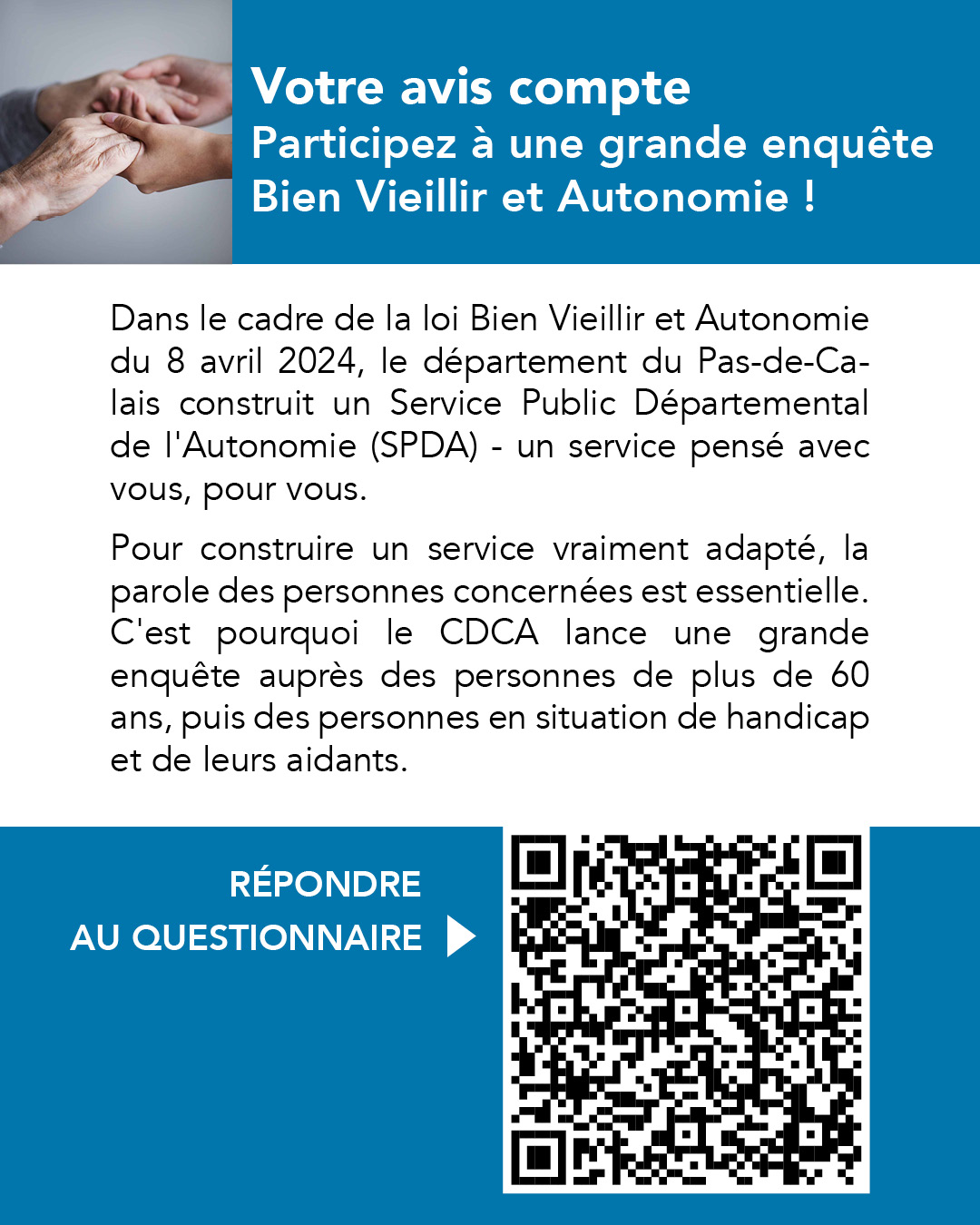 Répondez au questionnaire ici : https://formulaires.pasdecalais.fr/service-public-departemental-de-lautonomie-62-concertation-aupres-des-habitants
